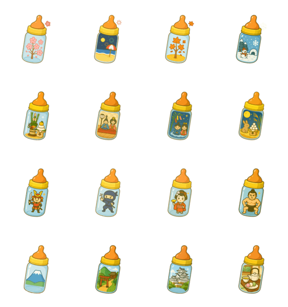 | スタンプ説明 | 哺乳瓶の中に広がる日本の名物や季節行事。飲めないけど、使いたくなる和風スタンプです。 |