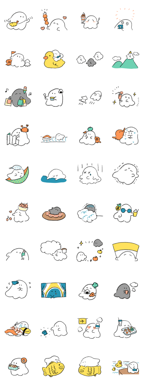 ※こちらは「おいしいおばけ旅行」の文字無し版です。 海に山に海外旅行・・・遠くでもちょっと近場でも、お出かけに使える旅行をするおばけちゃんのスタンプです。