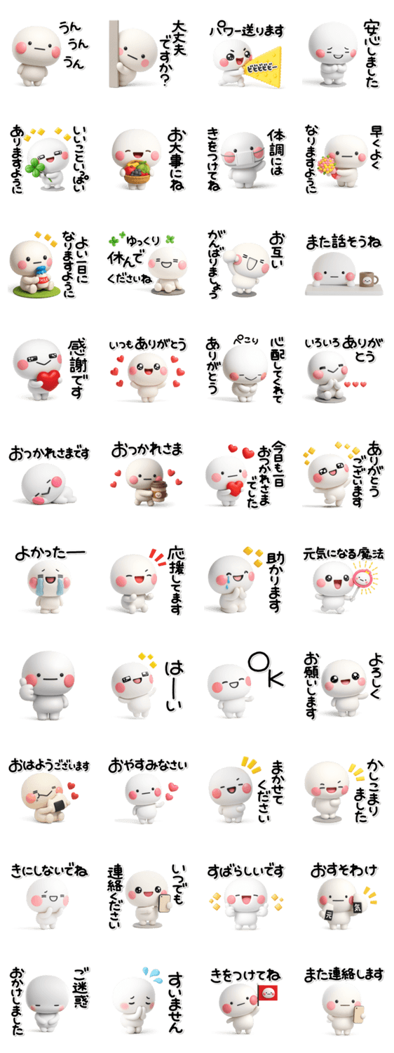 | スタンプ説明 | しろくてまるい子たちの思いやりスタンプです。ずっと使える内容を揃えましたのでスタンプ初心者の方にもオススメです。 |