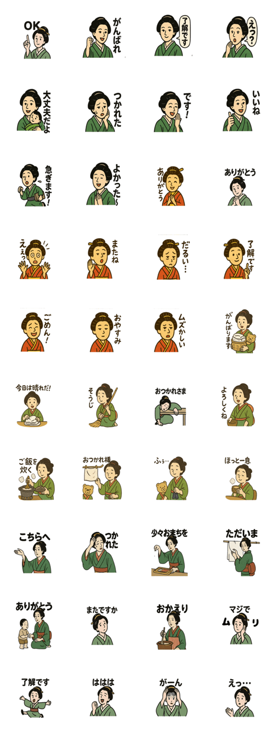 | スタンプ説明 | These charming stickers show a cheerful woman from the Edo period managing daily chores like cleaning, cooking, and laundry. |