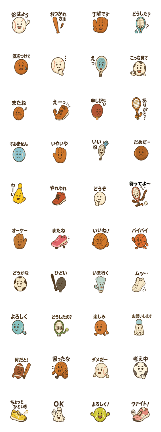 | スタンプ説明 | These cute and quirky LINE stickers feature sports equipment like balls, rackets, gloves, and shoes, all with funny faces and comical conversations! |