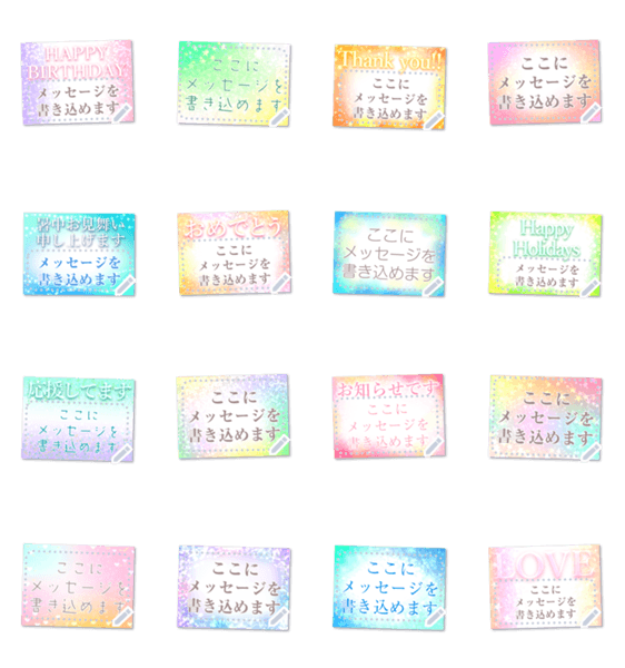 文字を打てる便利なハガキ型フレーム♪ カラフルポップなキラキラマーブル/グラデカラーが夏にぴったりのグリーティングカード♥見やすい!でか文字メッセージスタンプ 現在この商品は一部のスマートフォン版LINE 10.3.0以上のトークルームでのみ使用できます。動作環境の最新情報はヘルプをご確認ください。