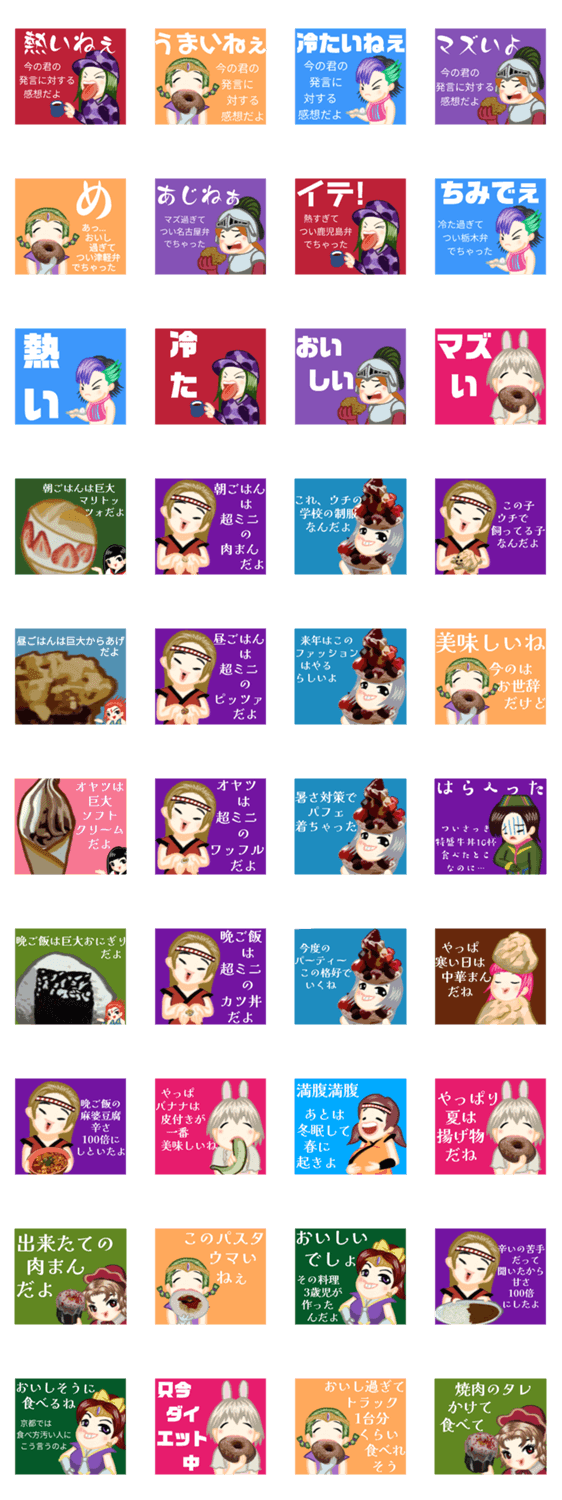 色んな食べ物(ドーナツ、パフェ、カヌレ、ソフトクリーム、マリトッツォ、中華まん、おにぎり、カレー、からあげetc…)を使ってボケまくりなスタンプ作ってみました。