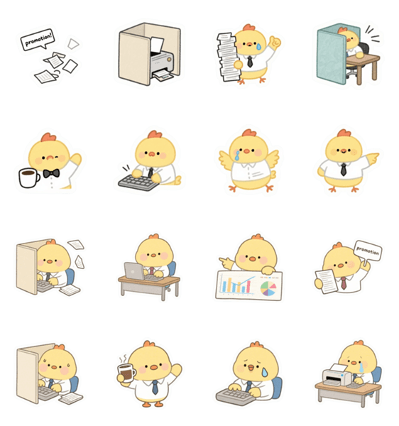| スタンプ説明 | Nine kawaii office chicks in funny, relatable work scenes typing, crying at printers, celebrating promotions, and more. Perfect for everyday work chats |
