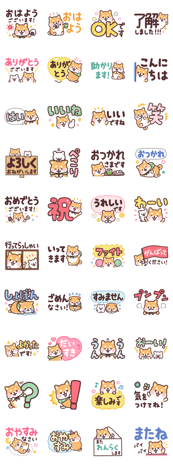 ころころ柴犬のデカ文字スタンプが出ました!大きい文字で見やすい、挨拶など基本の毎日使える内容です。友達や家族とのやりとりに、敬語丁寧語も入った万能セットです。