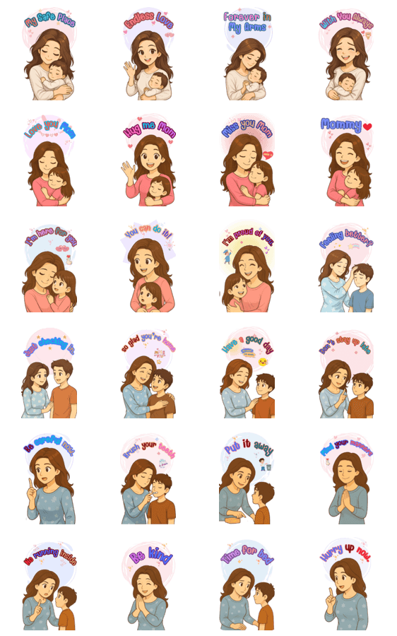 | スタンプ説明 | Show mom's love in every moment with big, warm stickers. Express care, joy, and sweet moments that make each chat feel special with mom's hug. These stickers will show up extra large in chats. |