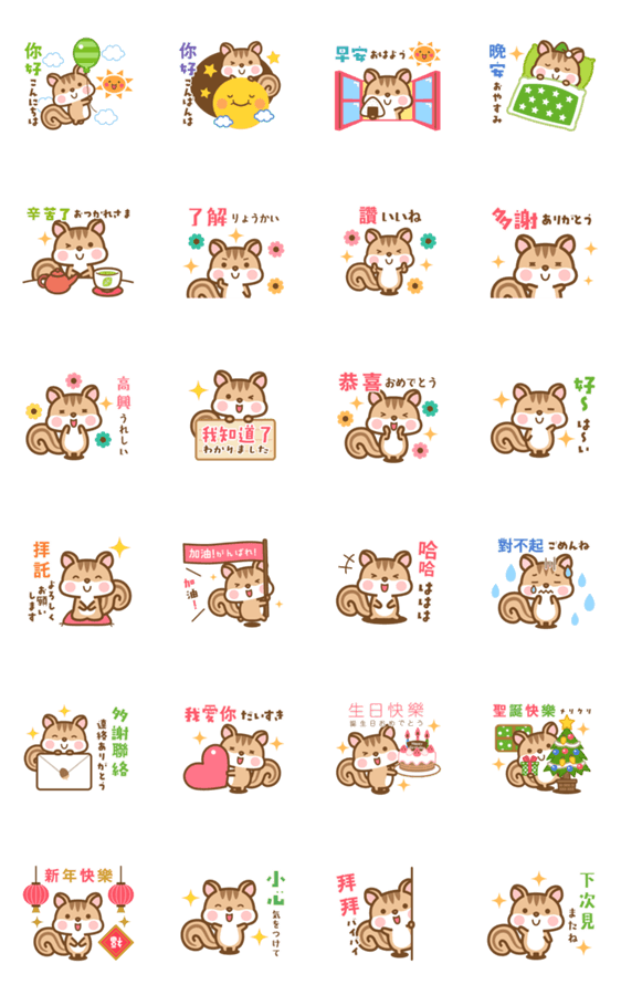 | スタンプ説明 | シマリスの「シマリさん」の日常の会話で使えるシンプルな台湾語&日本語のアニメーションスタンプです。クリスマス、お正月、誕生日スタンプ付き! |