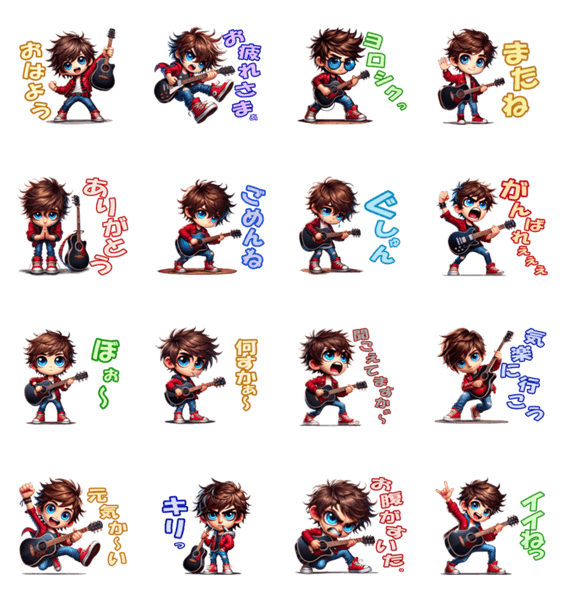 ロックにキメる!ギター小僧スタンプ♪ 大きな瞳が魅力的なギター小僧!元気・応援・ちょっぴりツンデレまで、使いやすさ満点っ♪