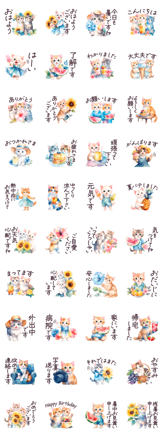 水彩風の猫のでか文字スタンプ。毎日/連絡/挨拶/敬語/丁寧/グループ/家族/友達/PTA/ママ友/猫/ねこ/ネコ/子猫/子ねこ/夏/サマー/でか文字/文字大きめ/老眼/シニア