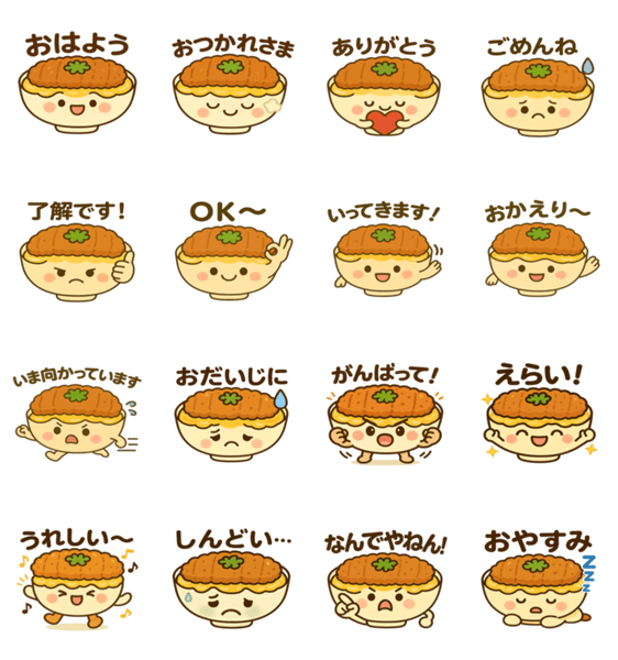 元気いっぱい!ほかほか笑顔の「かつどん君」。サクサクのカツとふわとろ卵が自慢♪毎日をほっこり応援してくれる癒し系キャラです。