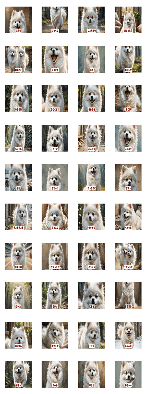 白いポメラニアンがあなたの気持ちをゆるっと伝える!ツッコミからあくび、しょんぼりまで、表情たっぷりの40個セットです