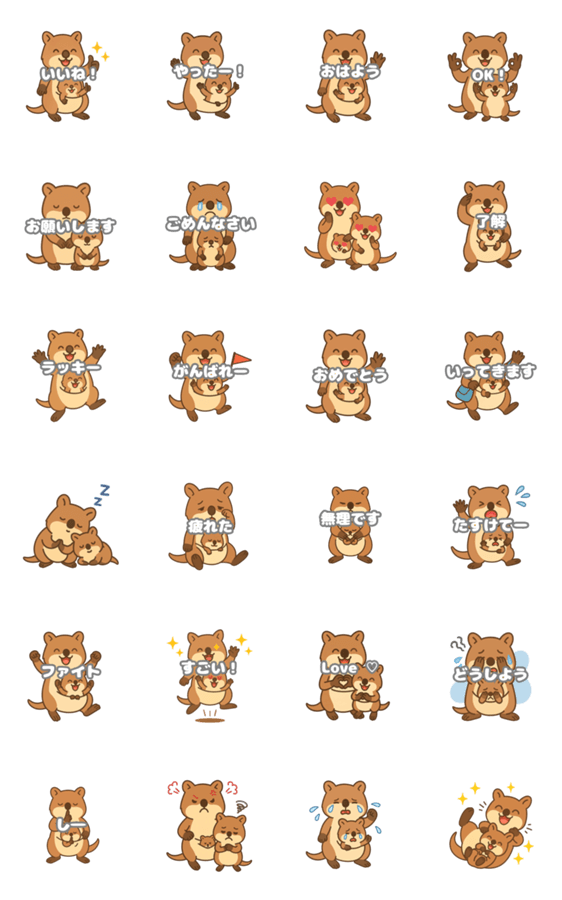 | スタンプ説明 | 表情ゆたかなクオッカ親子のスタンプです。うれしい気持ちも、怒った顔も、ちょっぴり悲しいときも。この子たちが気持ちをやさしく届けてくれます。 |