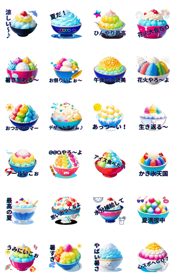暑い夏にぴったり!涼しげなかき氷で気持ちを伝えよう♪友達や家族との会話を涼しく彩る、夏限定の可愛いスタンプです。暑さを忘れる一息をお届け!