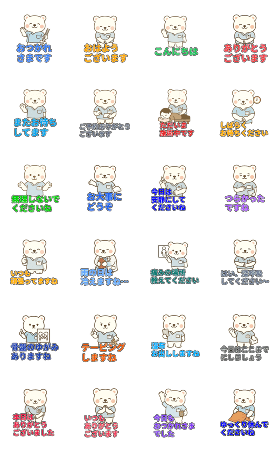整復院・接骨院・整骨院のしろくま柔道整復師が、いたわりと感謝を込めて送る日常スタンプ。あいさつ・施術・共感など使いやすい表情が満載!
