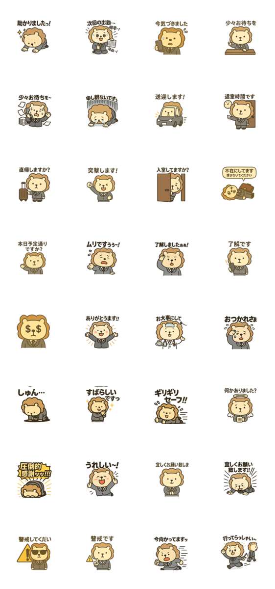 内勤スッタフのスーツ姿のライオンが日常や仕事の感情を表現!ゆるくてクセになる万能スタンプ。友達や社内トークにもぴったり!