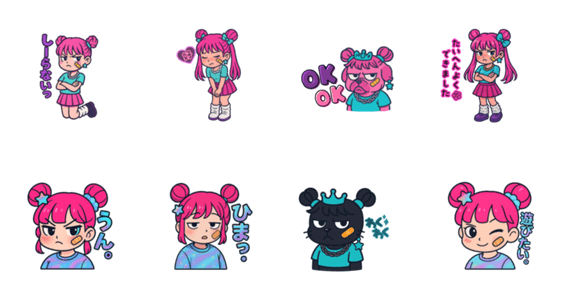 ピンクお団子ツインテール&頬絆創膏のY2Kツンデレ少女「ばんこちゃん」!怒りも照れも可愛く彩る、トーク映え必至の便利スタンプです‼︎