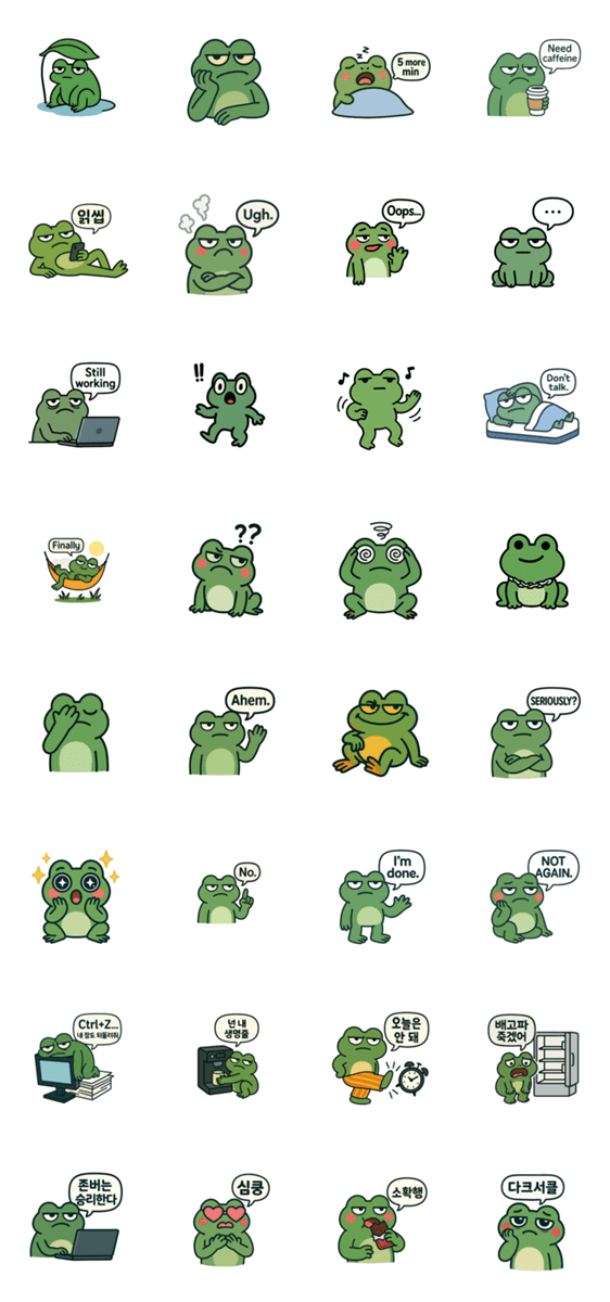 | スタンプ説明 | Cranky Frog brings 24 hilarious expressions to your chats! From slam-that-snooze button mornings and desperate coffee hugs, to grumpy vibes and snack. |
