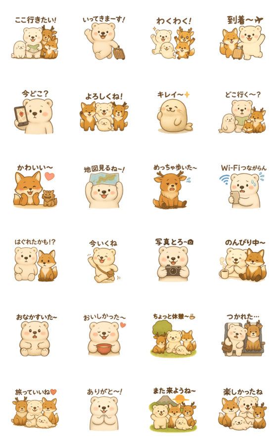 旅の前から旅の途中、そして帰り道まで。くまよしさんたちが旅の気分を盛り上げる、かわいくて便利なスタンプセットです♪