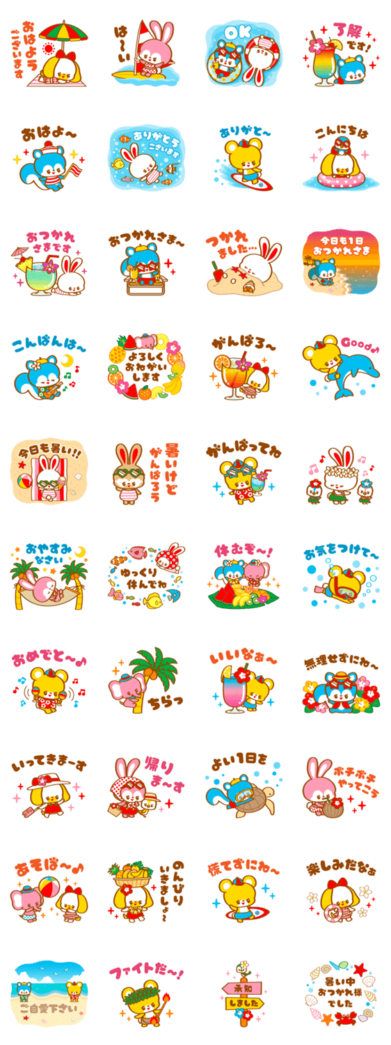 | スタンプ説明 | リゾート&サマービーチを楽しむ、おちゃめフレンズの夏スタンプです♪【日常会話/敬語/海/くま/リス/うさぎ/犬/昭和レトロ/レトロポップ】 |