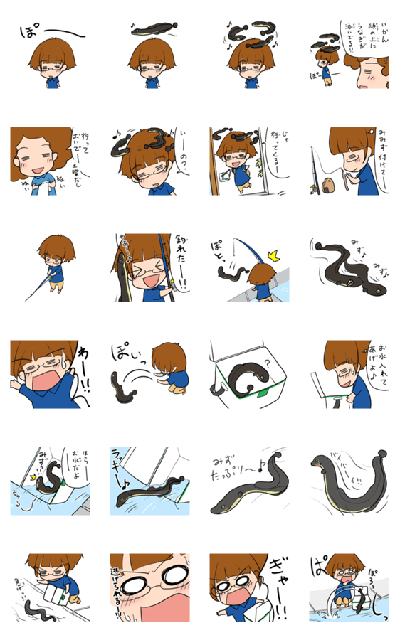 モナモナキッチン 土用の丑の煮うなぎ(1)LINEスタンプです。うなぎ釣りで釣れた!逃げられそうで大ピンチなシーンを収録しています。うなぎ釣り好きな方にぜひ。