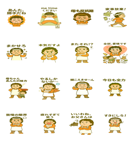 | スタンプ説明 | 肝っ玉母ちゃんが帰ってきた!寝不足、愛情たっぷり、ちょい毒舌。シリーズ3は毎日のドタバタ感情をスタンプでお届け! |