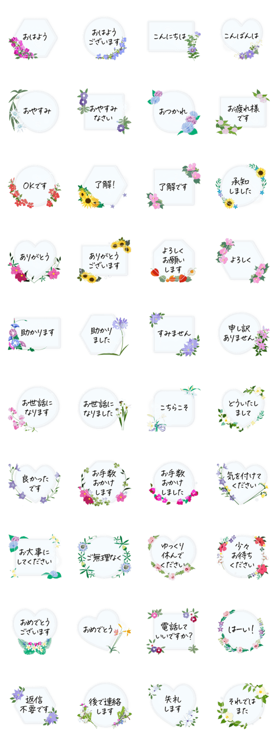 毎日の会話に花とフレームのスタンプ、ひとこと敬語の挨拶。ご家族やお友達とのおしゃべりにご利用ください。