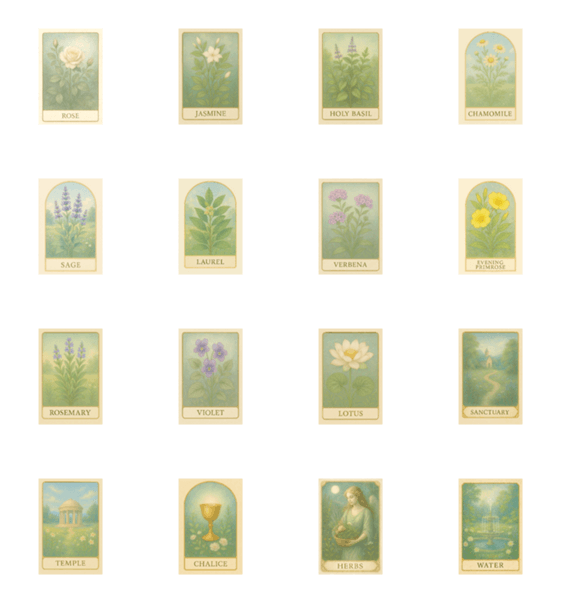 | スタンプ説明 | 上部はハーブや花々-それぞれが精霊的な波動を宿しています。下段はTemple・Goddness・Chaliceなど植物界から神殿界へ移行。自然界の叡智と内なる聖域が会話に寄り添う時 |