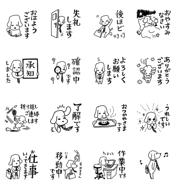 ビジネス犬の仕事でも使える基本挨拶スタンプです。犬/シンプル/ゆるい/線画/脱力/かわいい/白/挨拶/日常/ビジネス/仕事/連絡/毎日/1年中/ずっと使える