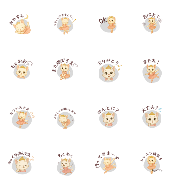 | スタンプ説明 | A sweet white kitten with big round eyes dances as a ballerina! Expressive and adorable, these stamps are perfect for adding cuteness to your daily chats. |