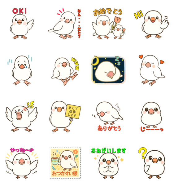 かわいい白文鳥さんが色んな表情でお話しているスタンプです