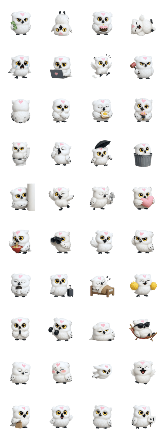| スタンプ説明 | かわいい白いフクロウのスタンプ、 かわいい動物のスタンプ、 フクロウのアニメスタンプ、 無言のスタンプ、 セリフなしのスタンプ |
