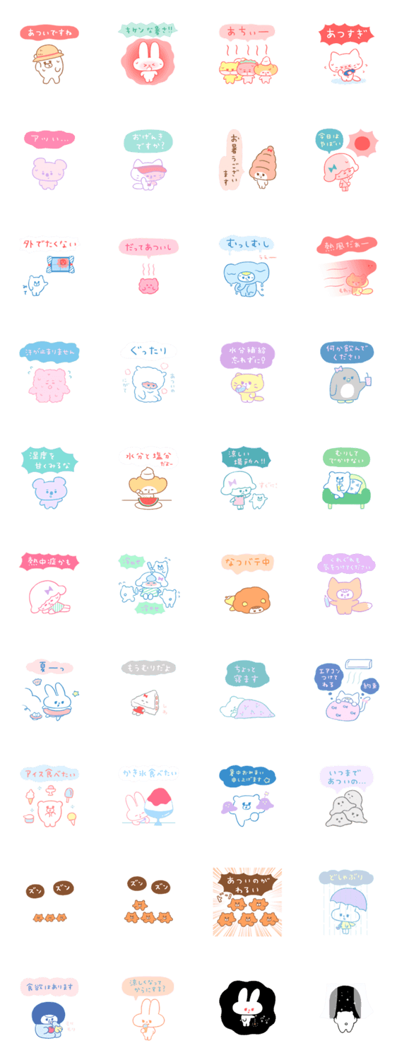 るーしーとくま、むくみちゃんを中心にパンたちやどうぶつたちも登場するあっつい夏のスタンプです。