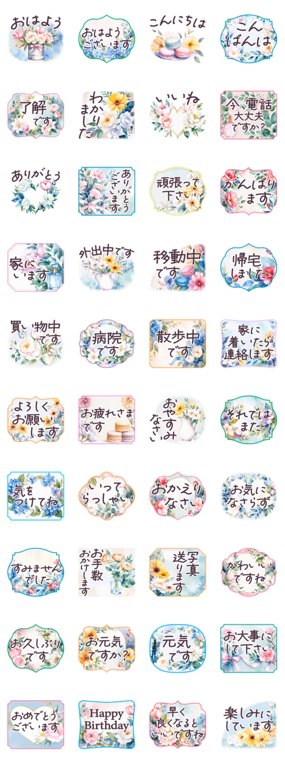 文字大きめのお花カード風スタンプ。グループ/PTA/ママ友/先輩/友達/敬語/丁寧/挨拶/花/お花/ブーケ/でか文字/文字大きめ/シニア/老眼/水彩