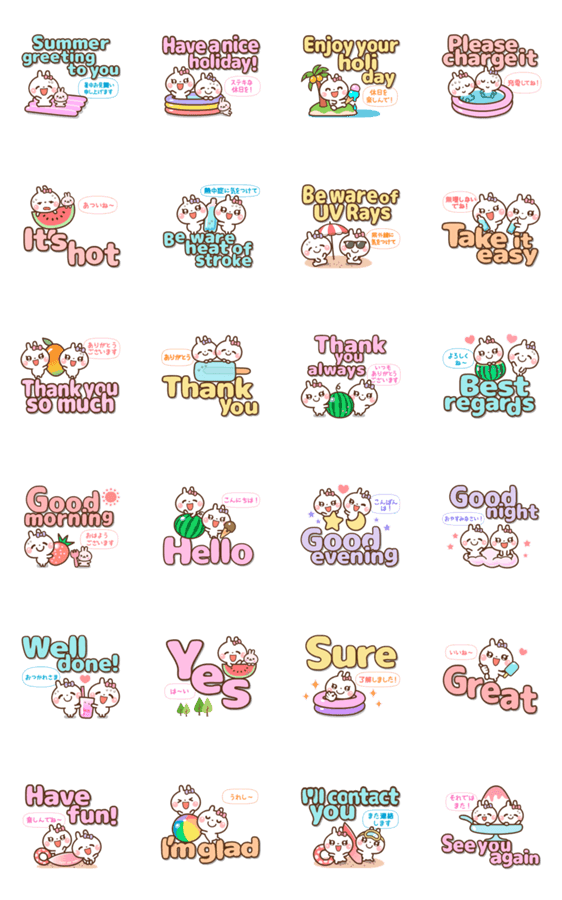 夏の毎日によく使うメッセージを集めたプチ耳BABYのでか文字♡英語&日本語版スタンプです♪暑中見舞いのメッセージ付きですよ〜♫