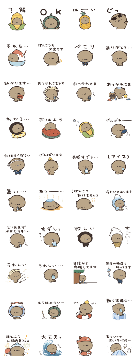 暑い日も、のんびりマイペース。 くまのぽんこつが、日常の返事やゆるいリアクションを届けます。 気軽に使える、夏らしい日常スタンプです。