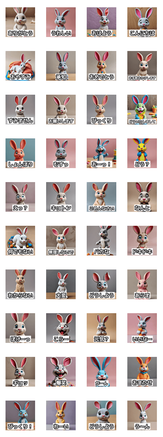 「ありがとう」も「がーん」も、ぜんぶこの子におまかせ。 ちょっとレトロで、ちょっとシュールな表情ゆたか系うさぎスタンプです。日常使いにぴったり!