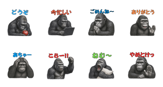 | スタンプ説明 | 人間の気持ち?任せてくれ。オレらが表情とジェスチャーでばっちり伝える!LINEでも、みんなを笑顔にしてみせるゴリ! |