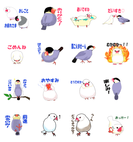 | スタンプ説明 | 文鳥さんの何気ないしぐさがかわいい、イラストスタンプです。 |