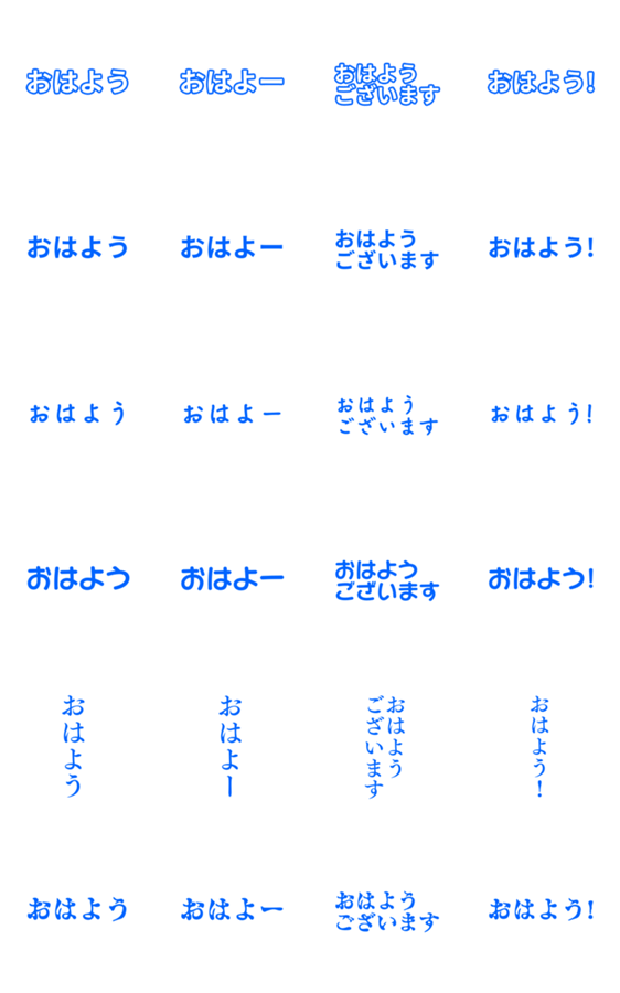 青の色々な書体のおはよう・おはよー・おはようございます・文字のみ・文字だけ・絵がない・ペン字・丸文字・明朝体・ミステリ風・白色のふち取り有・メンカラ・ブルー