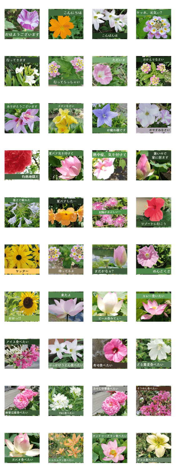 夏の花(朝顔、ハイビスカス、蓮、百合、ムクゲ、桔梗、ランタナ、夾竹桃、サルスベリ、向日葵、オダマキ等)を使ってあいさつスタンプ作ってみました。