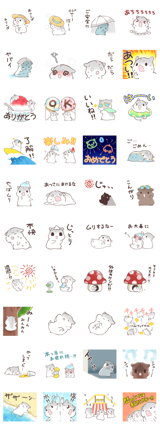 | スタンプ説明 | あわはむシリーズ第40弾。猛暑を乗り切るときに役立つハムスタースタンプです。 |