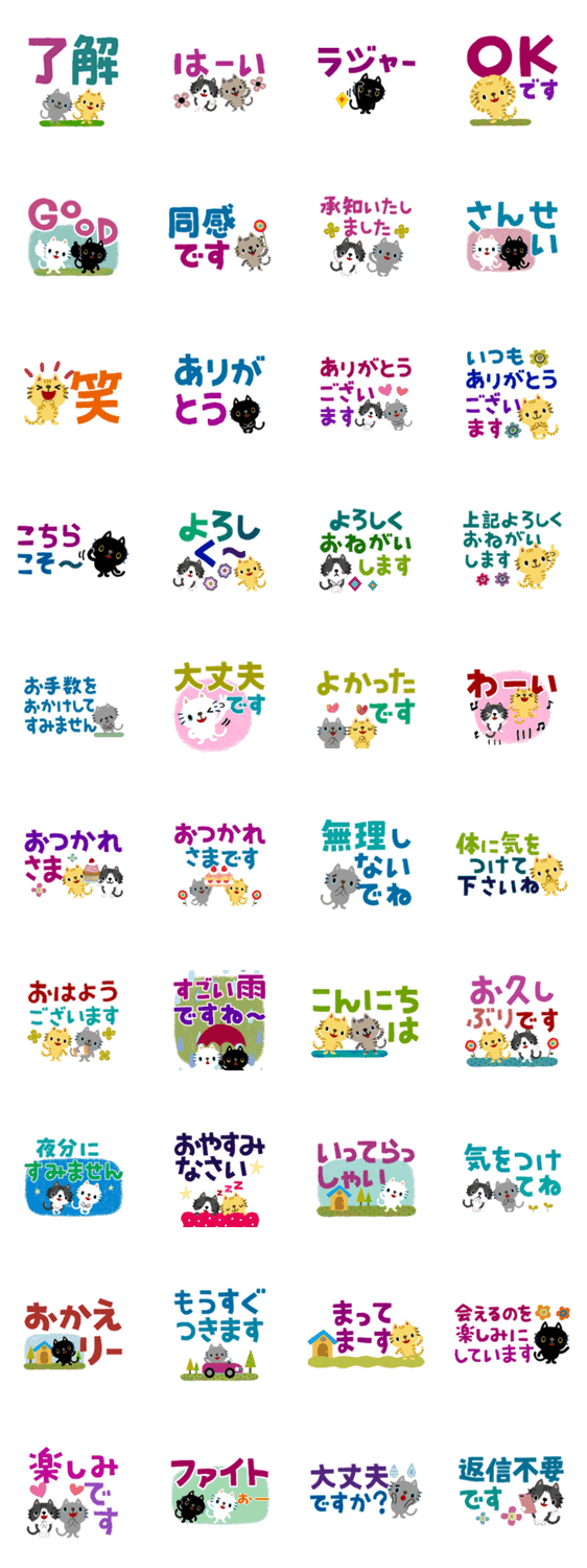 ちびねこたちの毎日使えるでか文字スタンプです。 日常会話に使いやすい言葉いろいろ、敬語も入っています。