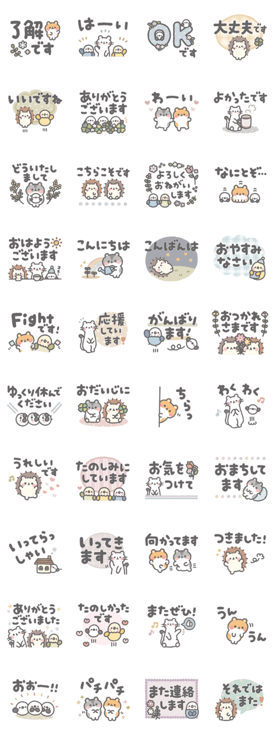 ちいさな動物たちの、大きくて見やすい文字の敬語スタンプです。挨拶や日常会話に使えます♪ オコジョ/ハリネズミ/ハムスター/シマエナガ/インコ
