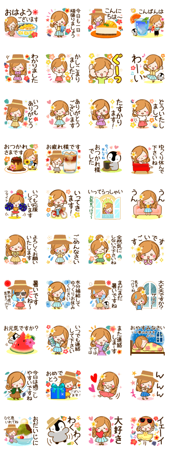 夏から残暑へと毎年ずっと使える日常敬語スタンプです♥よく使う言葉を集めてより使いやすくしました♡ステキな夏をお過ごし下さい♪「ほのぼのカノジョ」シリーズ