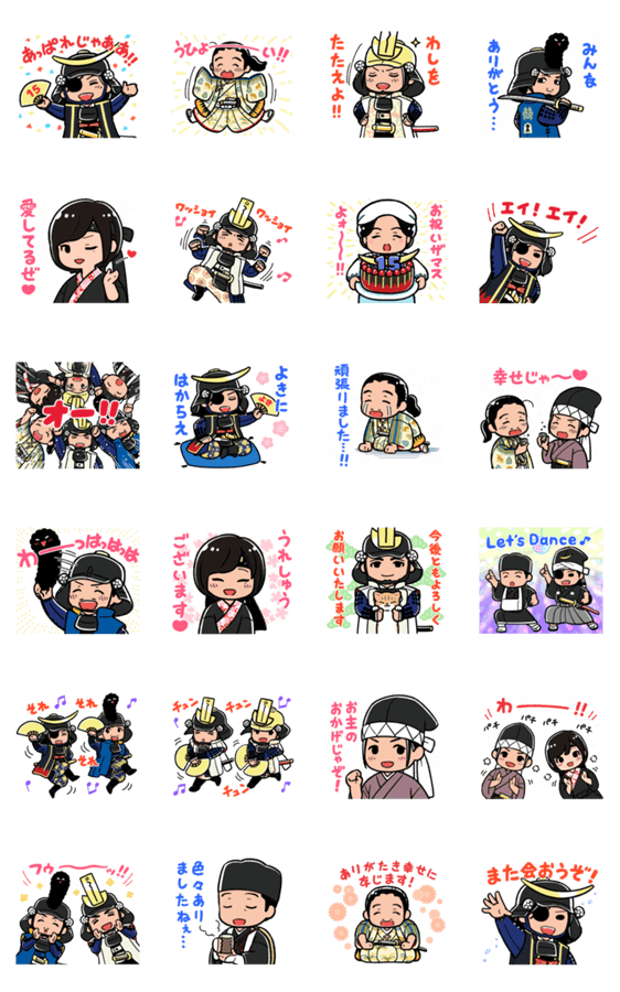 奥州・仙台おもてなし集団「伊達武将隊」の公式キャラクタースタンプです。 第七弾は結成15周年を迎えた伊達武将隊のお祝いをして盛り上がれるスタンプセットです!