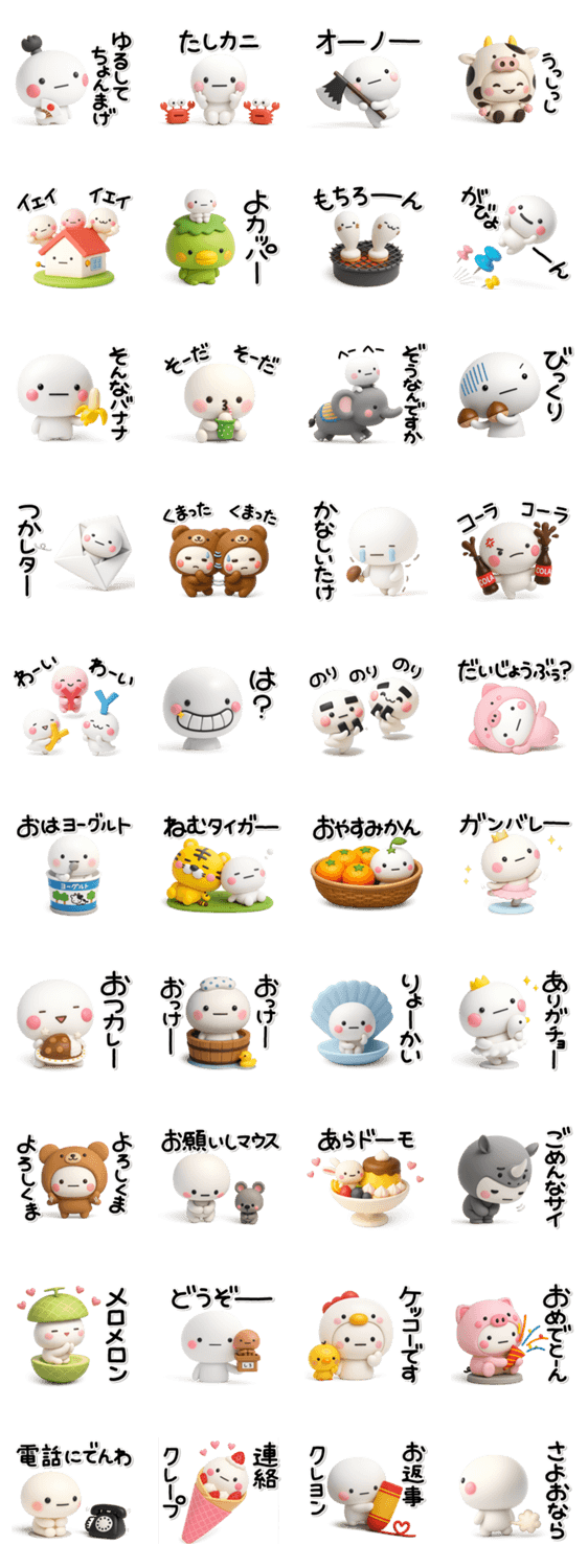 | スタンプ説明 | しろくてまるい子たちのダジャレのスタンプです。ずっと使える内容を揃えましたのでスタンプ初心者の方にもオススメです。 |