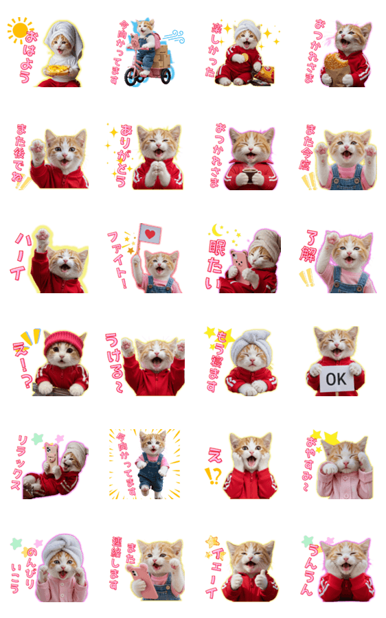 | スタンプ説明 | かわいいAI猫「にゃんこちん」の第二弾スタンプです。日常会話で使いやすい、癒し系&おもしろ表情が満載です♪ |