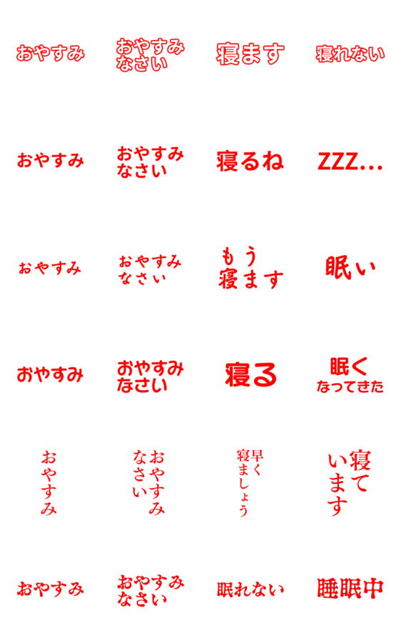 赤の色々な書体・おやすみなさい・寝ます・寝れない・眠い・睡眠・文字だけ・ペン字・丸文字・明朝体・好きな色・アイドルのメンバーカラー・推し・担当・メンカラ・レッド