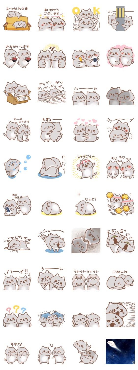| スタンプ説明 | 近所の地域猫の兄弟をモデルに毎日使いやすいスタンプを作りました。 かわいいです。 |
