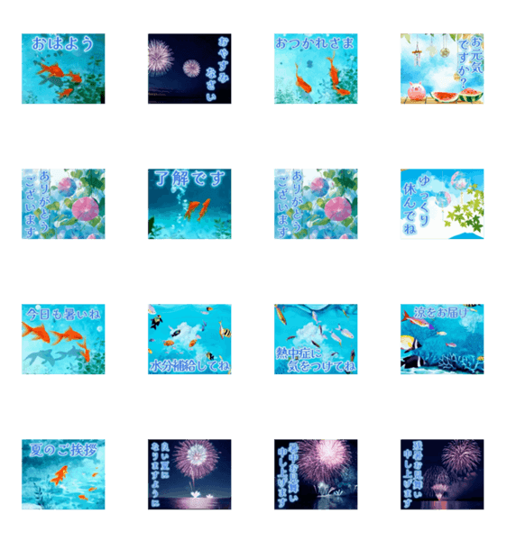 風鈴・金魚・花火・朝顔・海など、日本の夏を涼しく彩る動くスタンプ。暑中見舞いや日常の挨拶にぴったり。癒し・和風